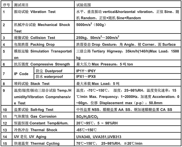 可靠性试验是为了保证产品在规定的寿命期间内,在预期的使用、运输或储存等所有环境下,保持功能可靠性而进行的活动。是将产品暴露在自然的或人工的环境条件下经受其作用,以评价产品在实际使用、运输和储存的环境条件下的性能,并分析研究环境因素的影响程度及其作用机理。通过使用各种环境试验设备模拟气候环境中的高温、低温、高温高湿以及温度变化等情况,加速反应产品在使用环境中的状况,来验证其是否达到在研发、设计、制造中预期的质量目标,从而对产品整体进行评估,以确定产品可靠性寿命。一般检测实验室将可靠性测试可分为机械和环境两大块。可靠性测试项目如下: